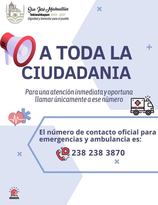 Dignidad y Bienestar para el pueblo de San José Miahuatlán Es momento de trabajar en comunidad a favor de nuestra región.Tekiwahkapan 2024-2027 Noticias Avisos importantes ¡AYÚDANOS A LLEGAR A TIEMPO!MARCA AL NÚMERO DE CONTACTO OFICIAL: 2382383870#dignidadybienestarparaelpueblo#tekiwahkapan2024_2027 Cultura